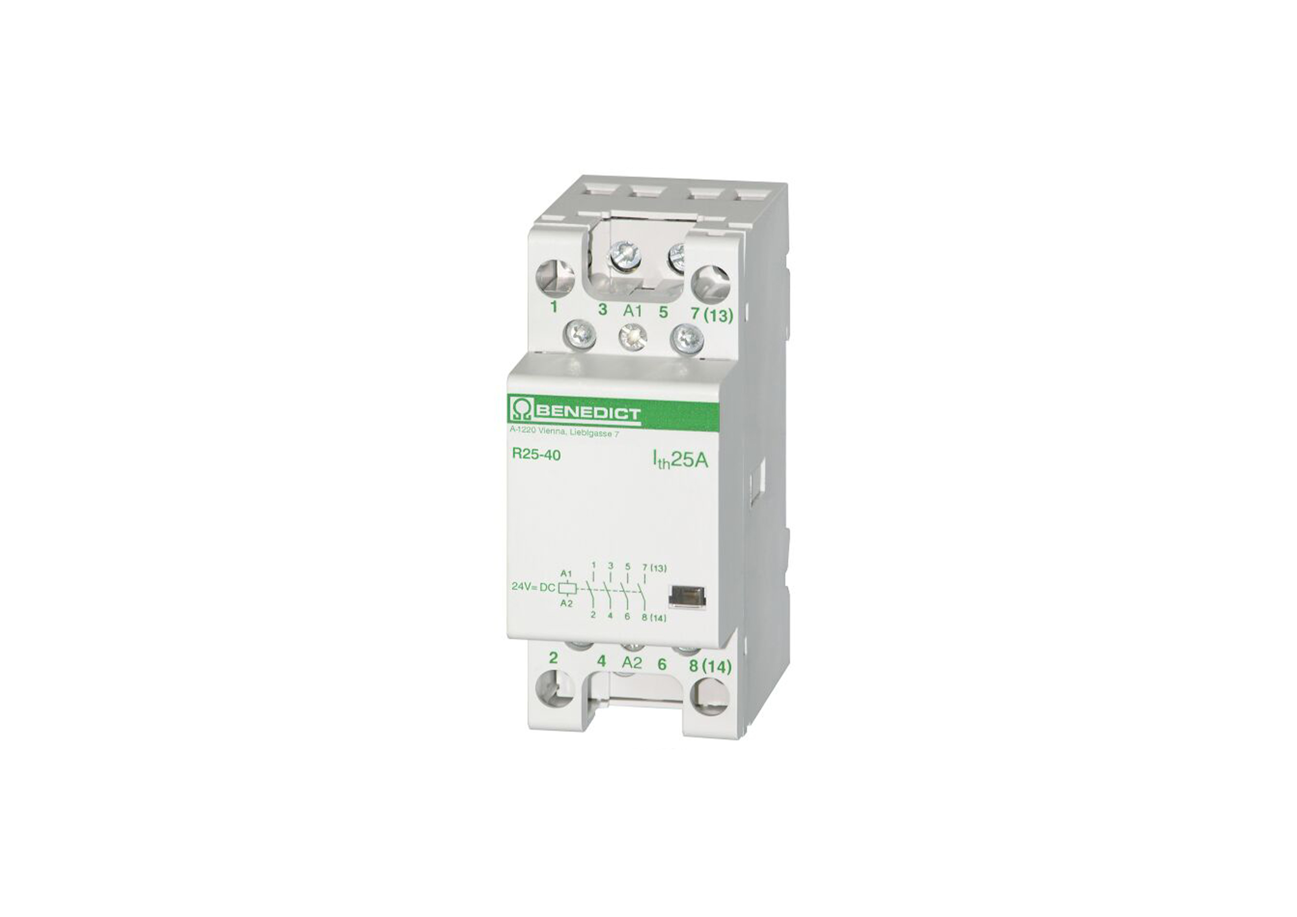 Installation contactor for distribution boards LOW NOISE 25A 4-pole 2NO+2NC, Coil 220-240V 50Hz 230-264V 60Hz, maximum switchable lamp loads!